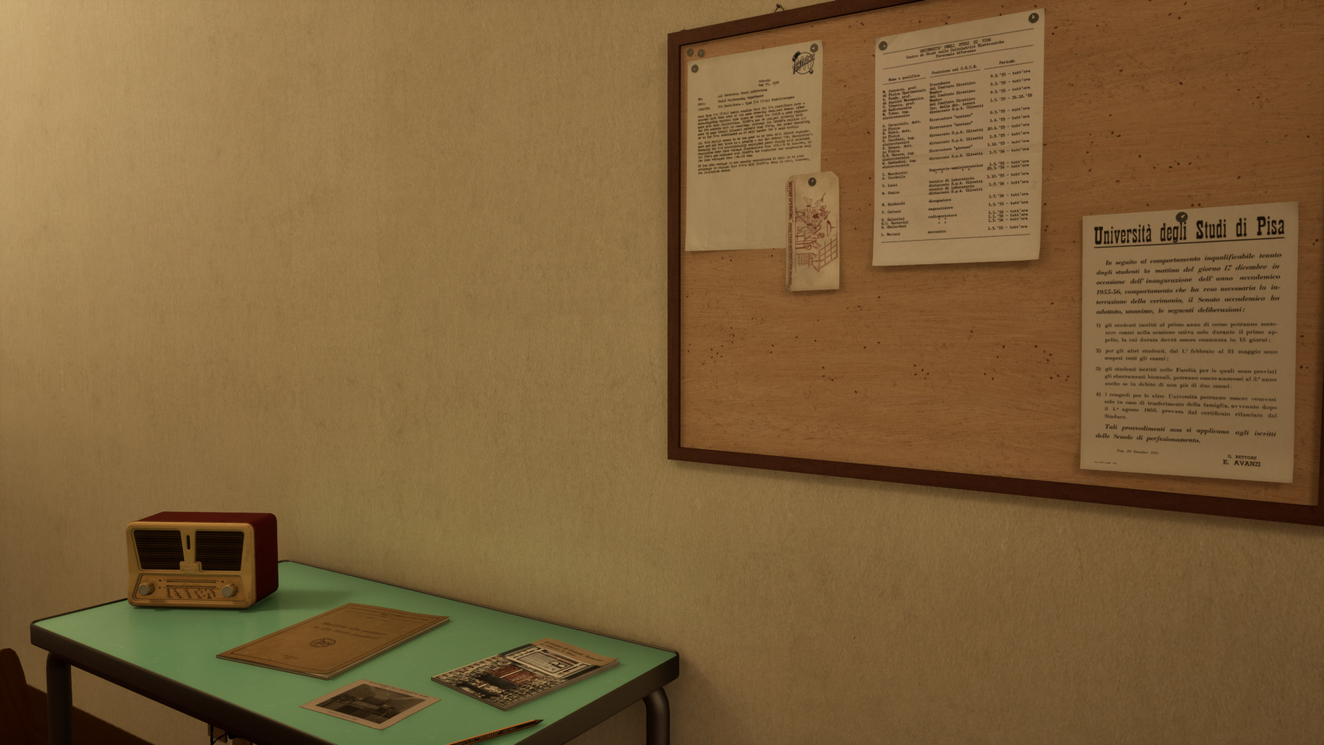 Il simulatore è stato integrato in Unreal Engine 4 dando una struttura al gioco e corredandolo di menù in stile (tirocinio e tesi triennale Talarico, luglio 2021). La stanza è stata arricchita dei primi oggetti di scena la cui presenza era testimoniata da fonti d’archivio o era comunque storicamente possibile e plausibile (tesi triennale Cateni, settembre 2022) e sono state realizzate le prime prove per dare alla stanza, mura, infissi accurati e un’illuminazione coinvolgente (tirocinio e tesi triennale Fusi, gennaio 2023). Per dare all’ambiente virtuale una colonna sonora adeguata, nella stanza è stata aggiunta una radio con più stazioni che trasmettono brani corrispondenti alle musiche più ascoltate in quegli anni (tirocinio e tesi triennale Scariot, maggio 2023). I brani sono distribuiti in un DLC del gioco. Da gennaio 2022 sono raccolti i dati delle attività di progetto, da allora a dicembre 2025 ha cumulato un impegno di circa 1.8 persone/anno; i dati sono stati oggetto di uno studio sull’uso di Scrum in progetti di sviluppo software complessi ma realizzati in contesti didattici (tirocinio e tesi magistrale Talarico).